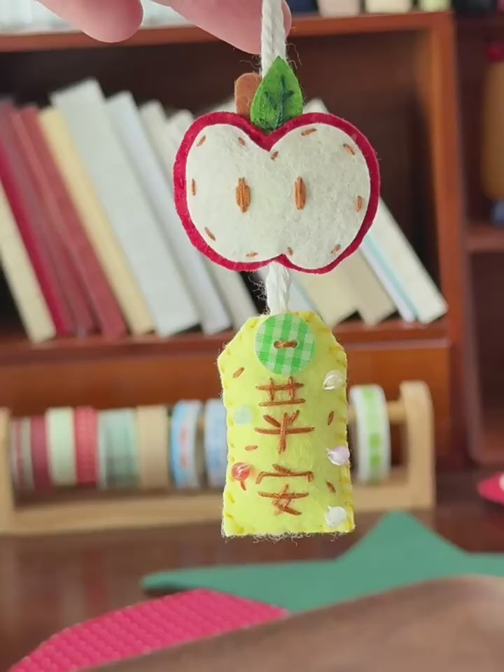 this adorable felt apple pendant is lovingly handmade with soft felt fabric and filled for a plush, cozy feel. the apple design is paired with a small banner embroidered with the chinese characters ‘苹安’, which symbolize peace and safety. decorated with tiny details and beads, it makes a meaningful keepsake, gift, or lucky charm.
